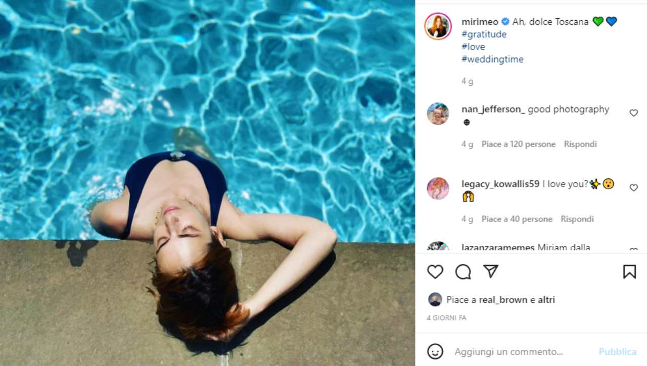 Intanto l’attrice si gode l’inizio dell’estate e del primo vero caldo del 2022 in Toscana. Miriam si trova nella regione per partecipare al matrimonio di alcuni amici e prima di prendere parte al lieto evento si rilassa nella piscina di un resort a cinque stelle. Lo scatto che la immortala mentre si rinfresca dall’afa è di quelli che lasciano senza fiato: Miriam è ripresa dall’alto con la testa chinata all’indietro e gli occhi chiusi. La posizione mette in mostra il procace davanzale e surriscalda gli animi dei suo fan più accaniti.